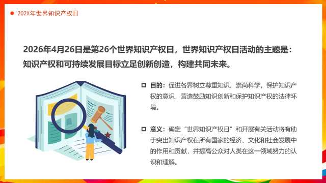 橙色卡通风世界知识产权日PPT模版【2026040805】 教学课件 如果您喜欢本模板,可以点击这里免费升级成为VIP,全站模板一律免费,欢迎持续关注,精彩模板每天推送 预览结束,一共25页,请下载后查看 如果您喜欢本模板,可以点击这里免费升级成为VIP,全站模板一律免费,欢迎持续关注,精彩模板每天推送 资源下载下载价格19 RMBVIP免费立即购买如果链接失效或充值问题,请将用户名或订单号发邮件到3204167195@qq.com,我们会帮您处理 0 教学课件
